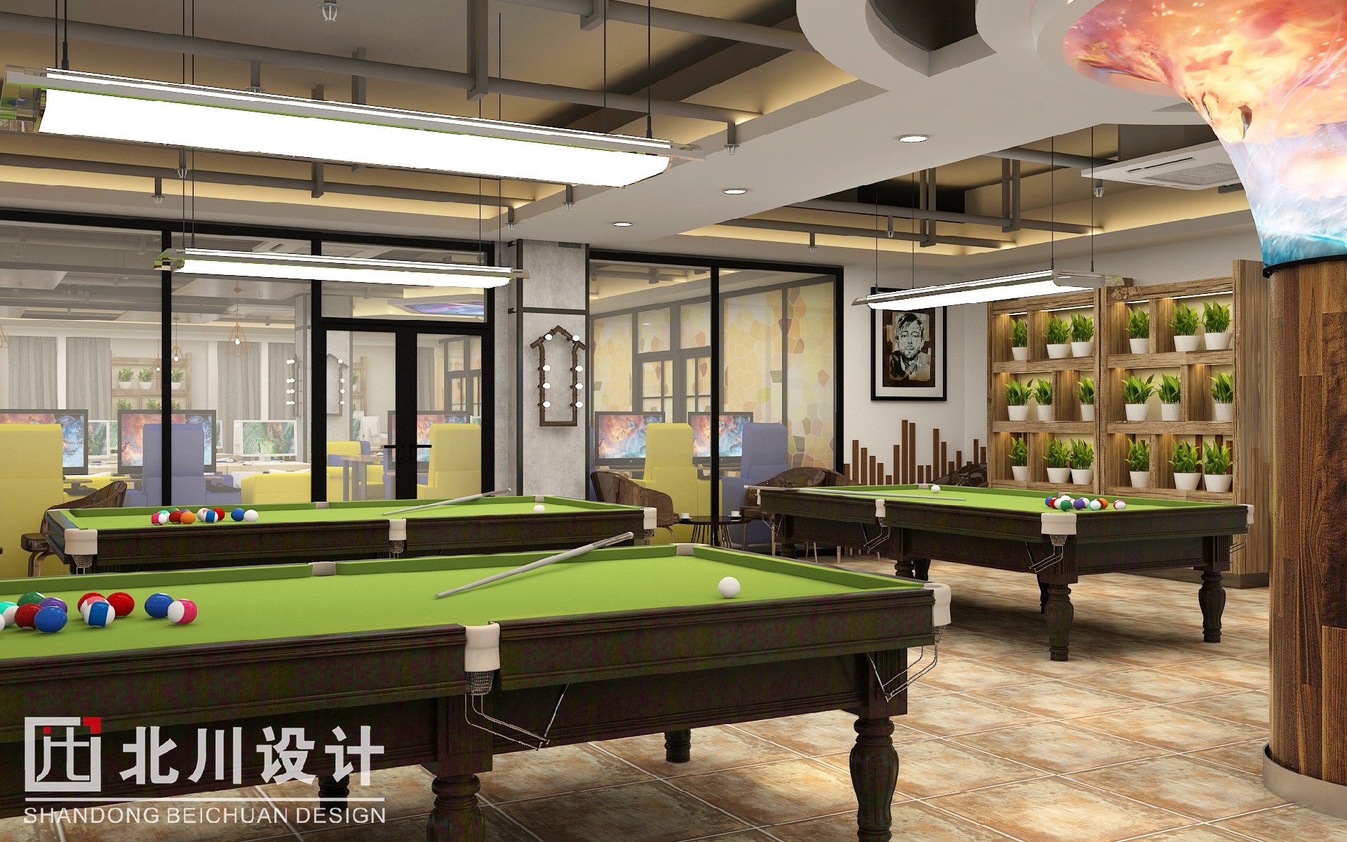 3.色彩搭配,本案的設(shè)計采用較為前衛(wèi)的設(shè)計以體現(xiàn)一種潮流的酷味。在色彩搭配方面主色調(diào)為原木色為主,配以棕色、藍(lán)色、黃色為點綴色。在天花設(shè)計方面,采用了包括了石膏天花造型以及富有工業(yè)特色的原頂和生態(tài)木相搭配符合A級防火規(guī)范。本案的墻面宜采用較為樸素的設(shè)計或者素色的造型設(shè)計,以便突出經(jīng)營的主體(電腦設(shè)備等)。本案的地面設(shè)計主要是仿古磚,一些特殊區(qū)域比如包房采用的木地板。