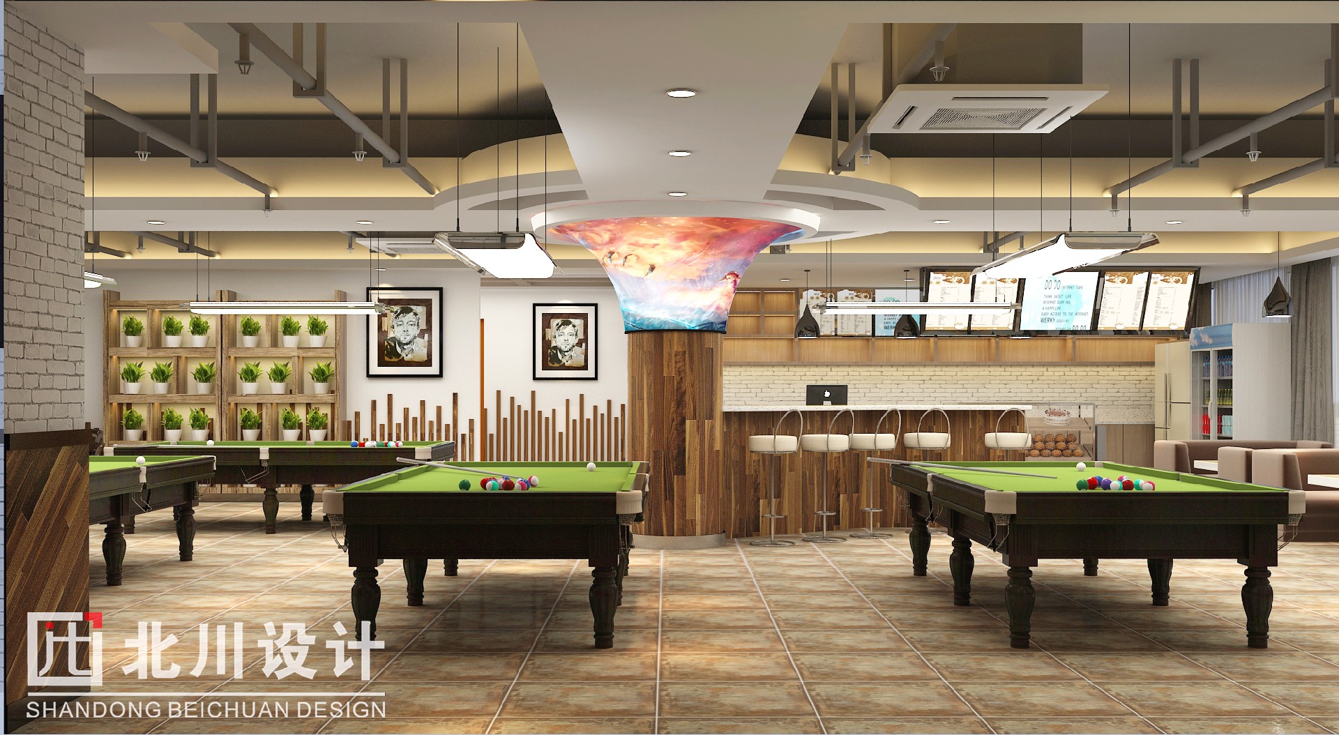 餐飲區(qū):中間應(yīng)業(yè)主要求增加吧臺餐飲休息區(qū),同時設(shè)置卡座區(qū),在提升玩家體驗舒適度的同時提高本項目的裝修檔次;有美味可口的餐點、咖啡飲料,區(qū)內(nèi)還放有供客人免費翻閱的各種雜志,滿足消費者的需求,等人聊天什么等等而此本案格調(diào)以網(wǎng)絡(luò)文化為載體,設(shè)計出供人休閑娛樂的現(xiàn)代綠色環(huán)保空間是集上網(wǎng)、休閑、娛樂、餐飲等為一體的綜合性服務(wù)場所。